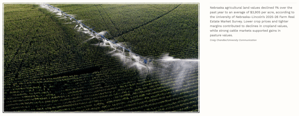 The value of agricultural land in Nebraska declined 1% over the past year to an average of $3,905 per acre as of Feb. 1, according to the preliminary report from the University of Nebraska–Lincoln’s 2025-26 Farm Real Estate Market Survey. It is the second consecutive year of declining land values since the market reached $4,015 per acre in 2024.
