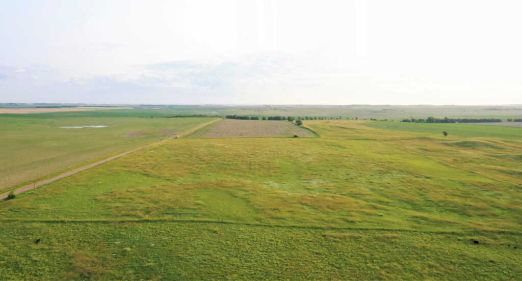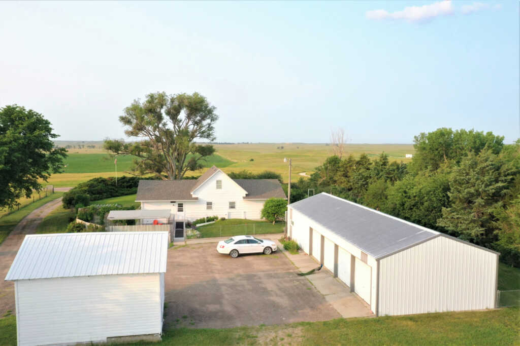 The property has been equipped with bins and established shelterbelts, along with a 2,032 sq. ft. home built in 1930, with 6 beds and 3 baths, and a detached four-car garage with a 140 sq. ft. heated workspace.