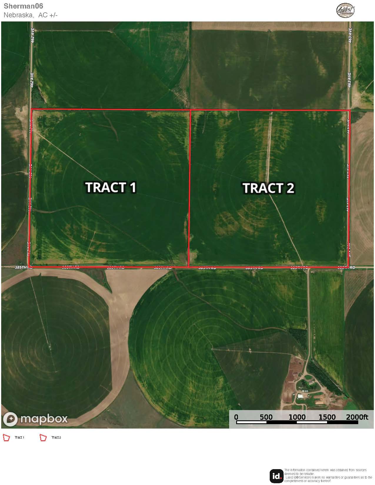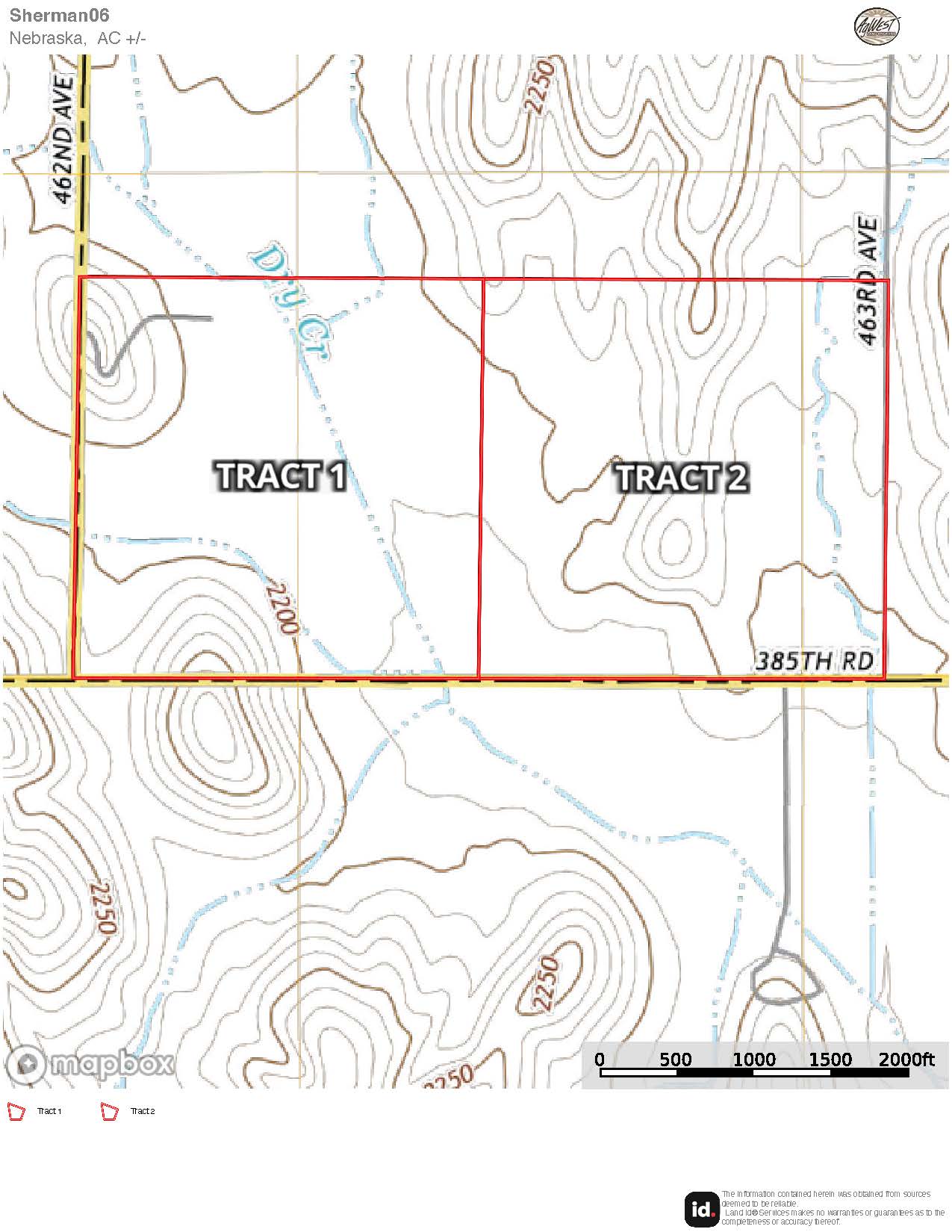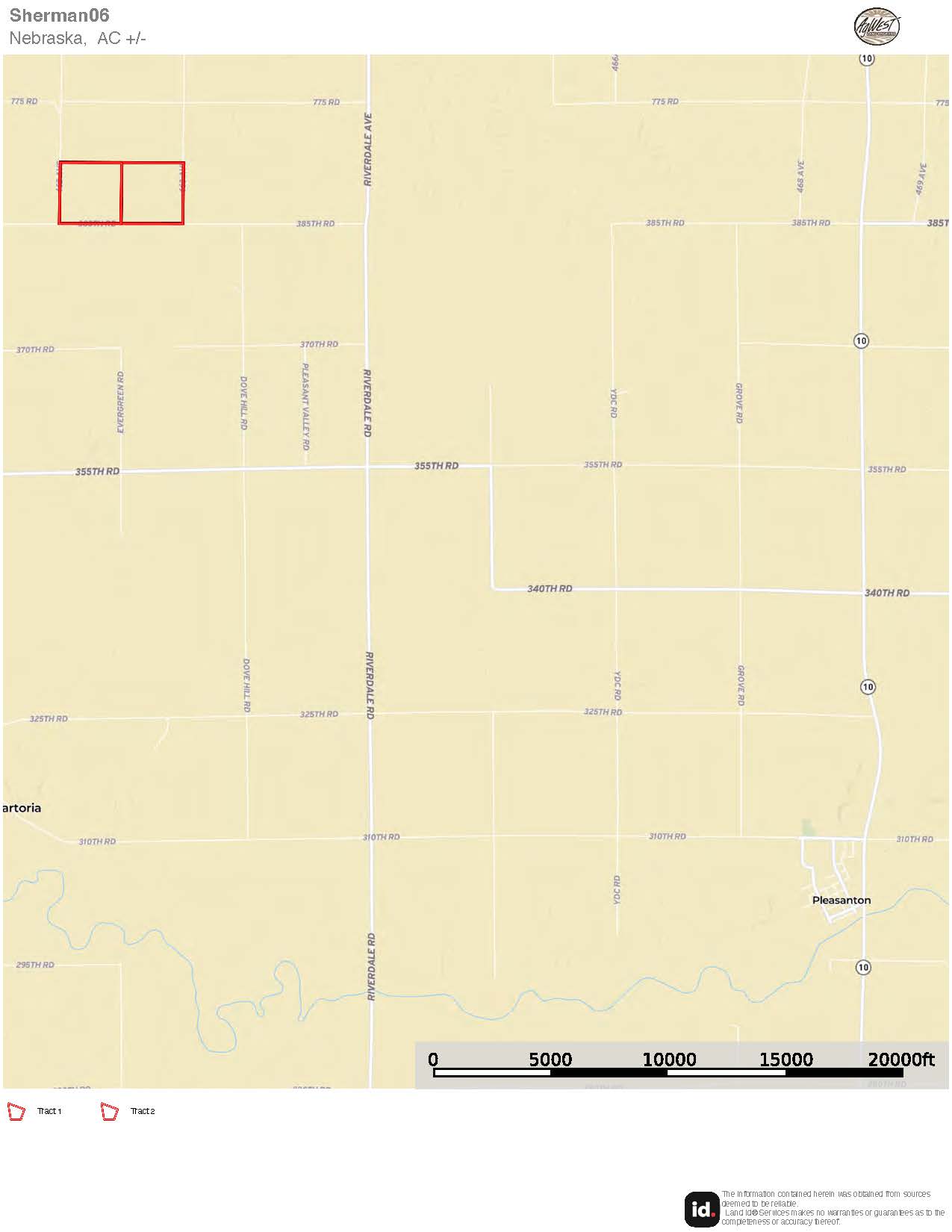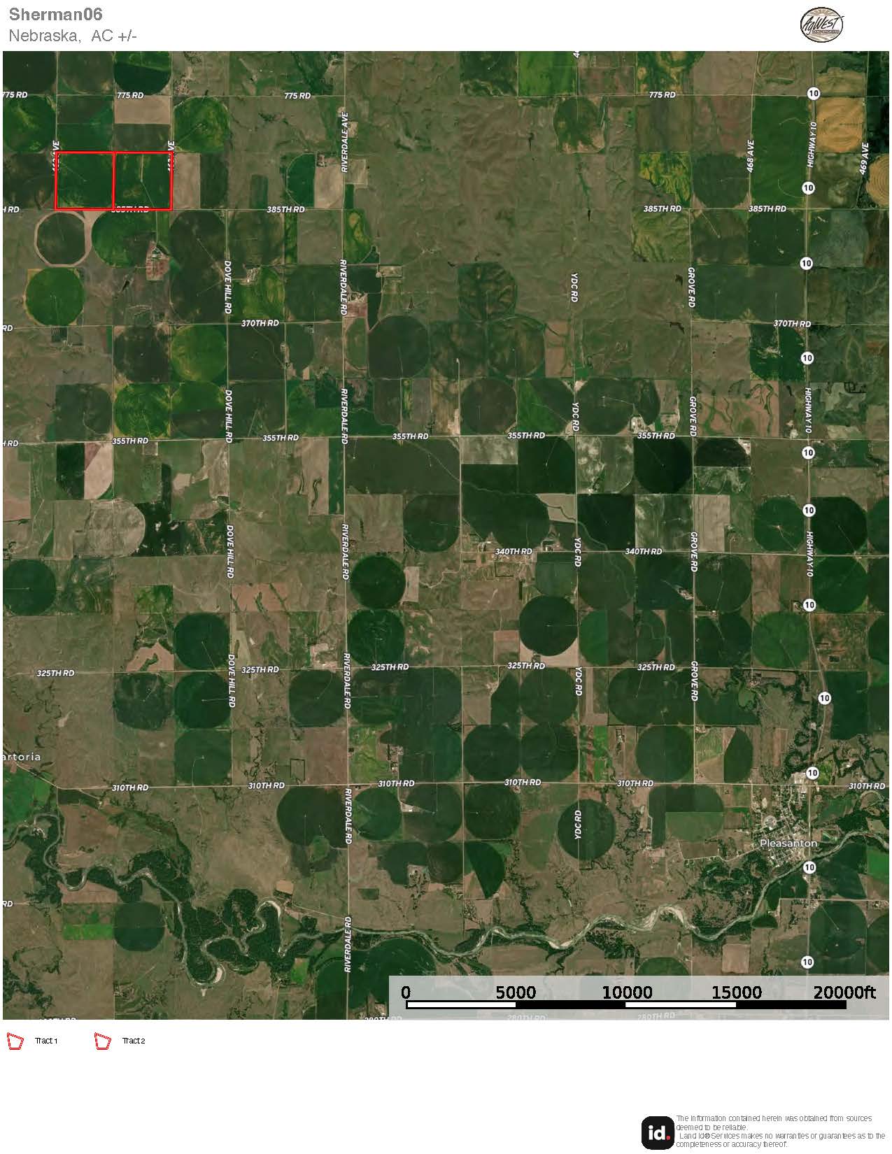From Pleasanton travel 3 miles north on Hwy 10 to 355th Road. Head west on 355th Road for 5 miles to Dove Hill Road. Travel north on Dove Hill Road 2 miles to 385th Road. Head west a 1/2 miles on 385th Road to 463rd Ave. Tract 2 will be on the northwest corner of 385th Road and 463rd Ave. Tract 1 is directly to the west.