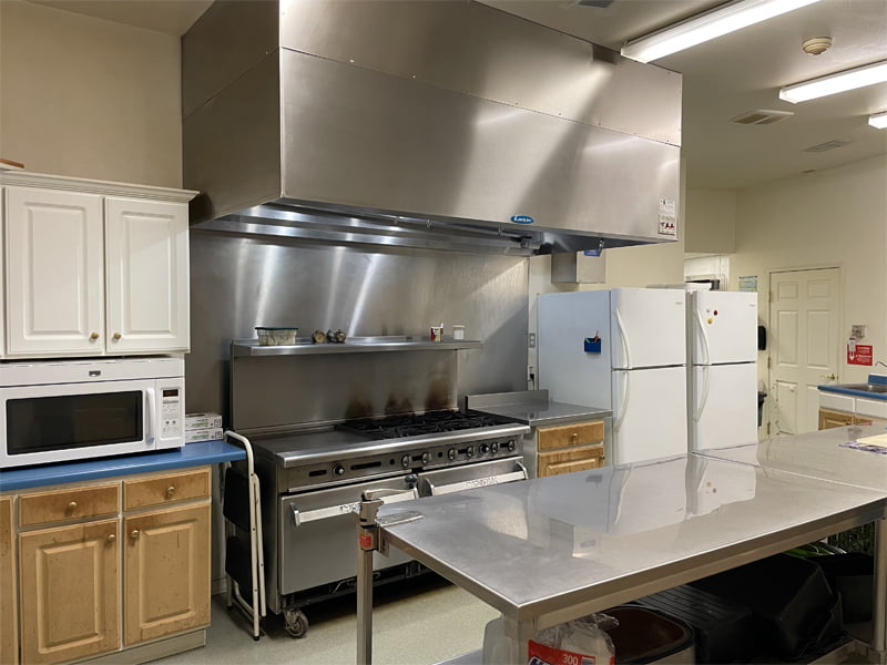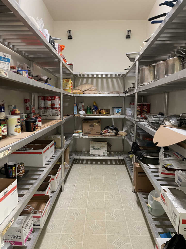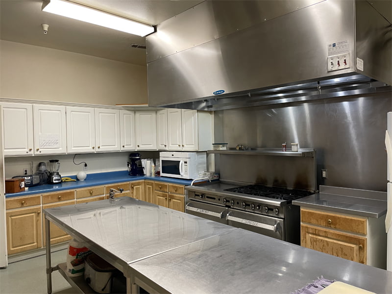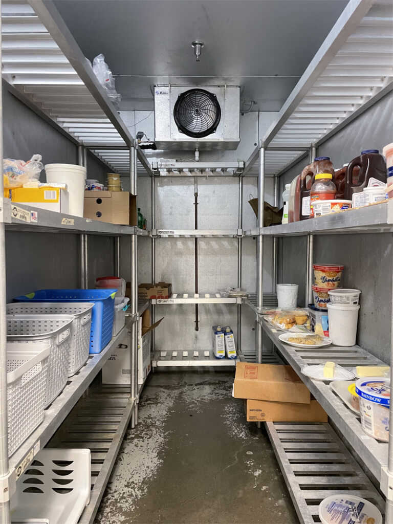 – A commercial grade kitchen facility with walk-in cooler