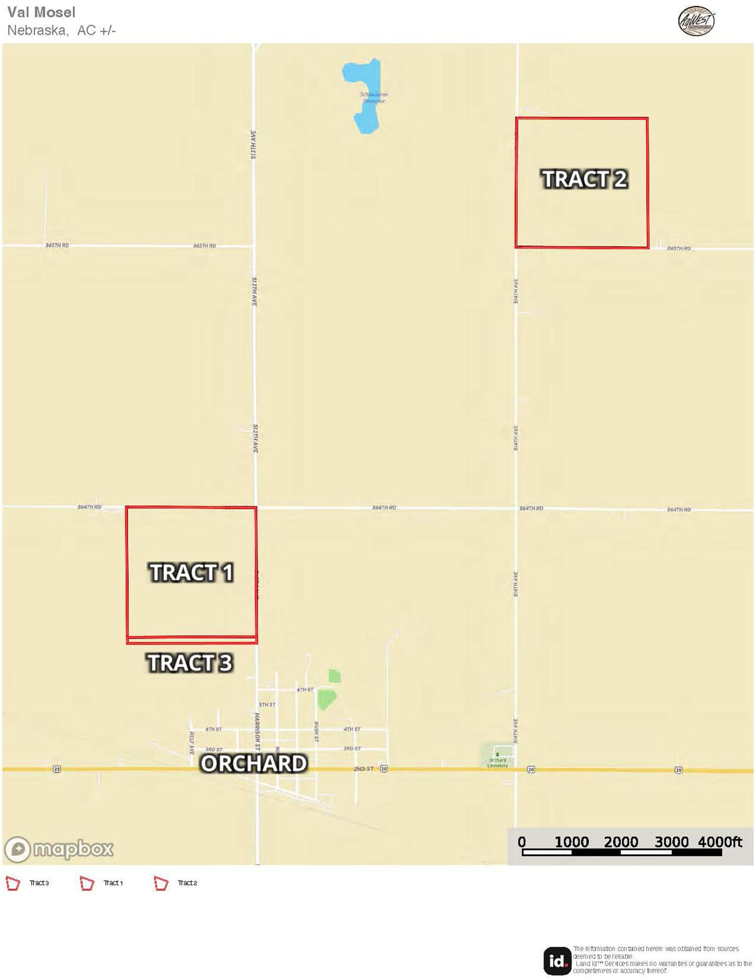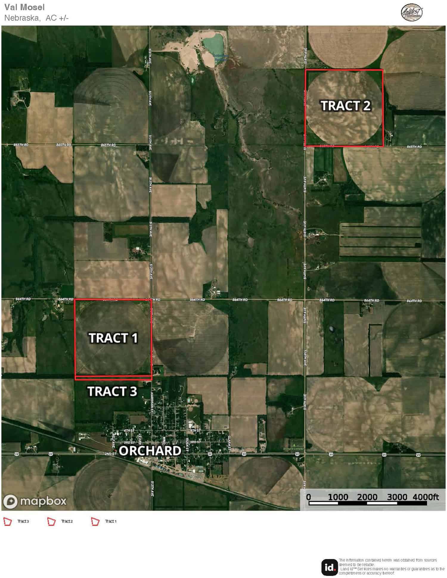 Tract 1: From Orchard, NE travel north on 513th Avenue for ½ mile to 864th Road. The farm will be on the the southwest corner of 513th Avenue and 864th Road.