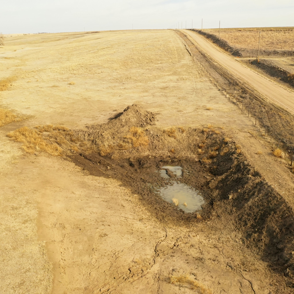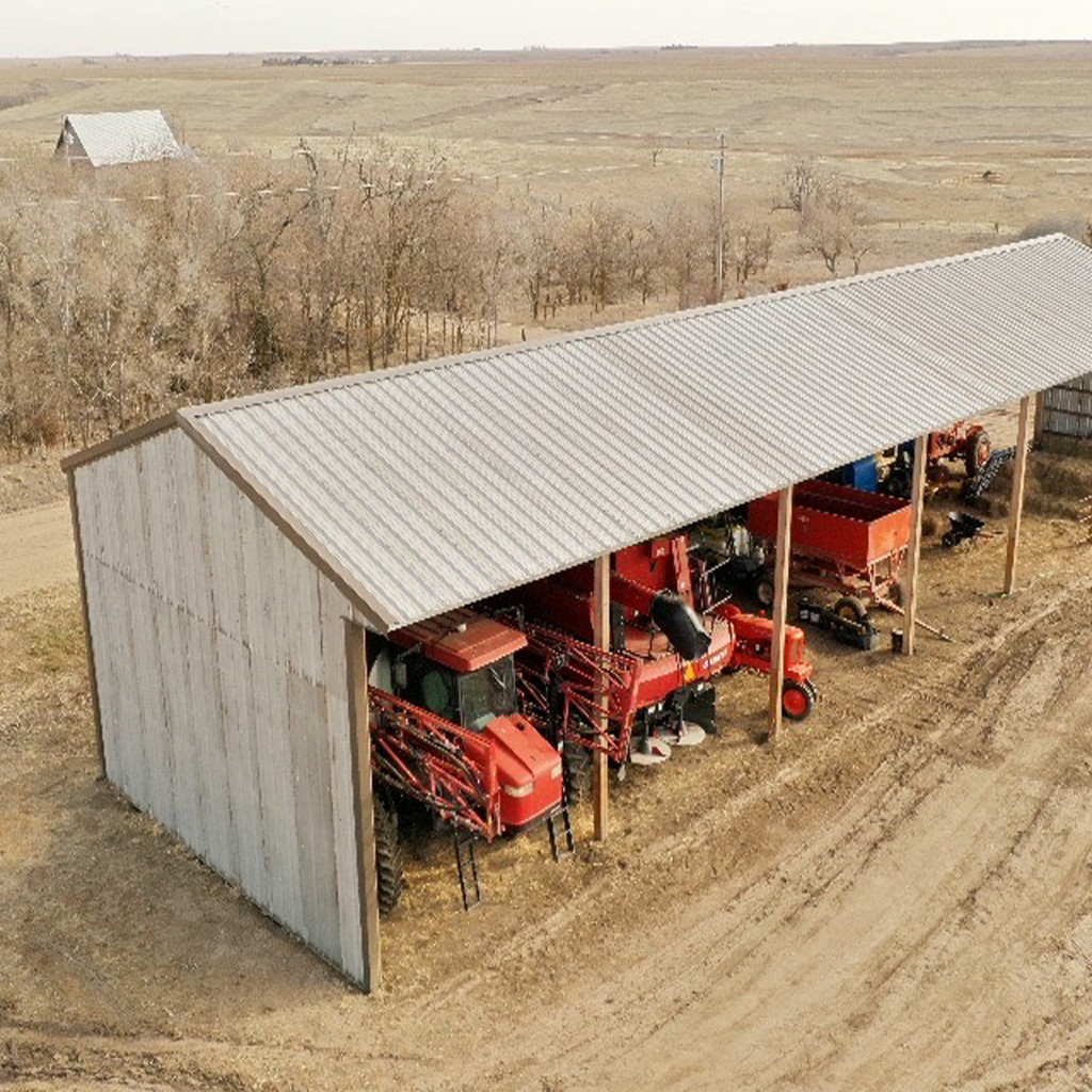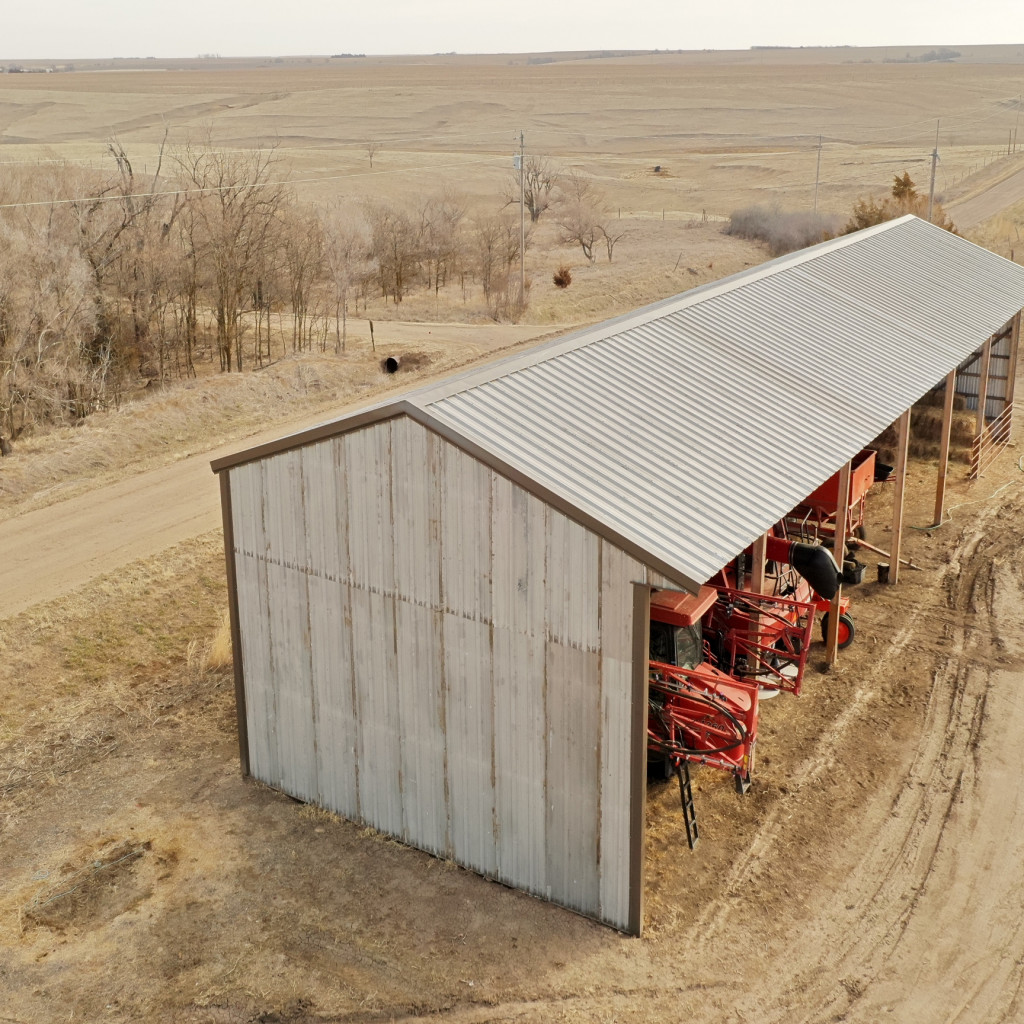 - Newly constructed 26’x96’x16′ open-faced storage shed and a small holding pen, built with new continuous fence panels just off County Road I.