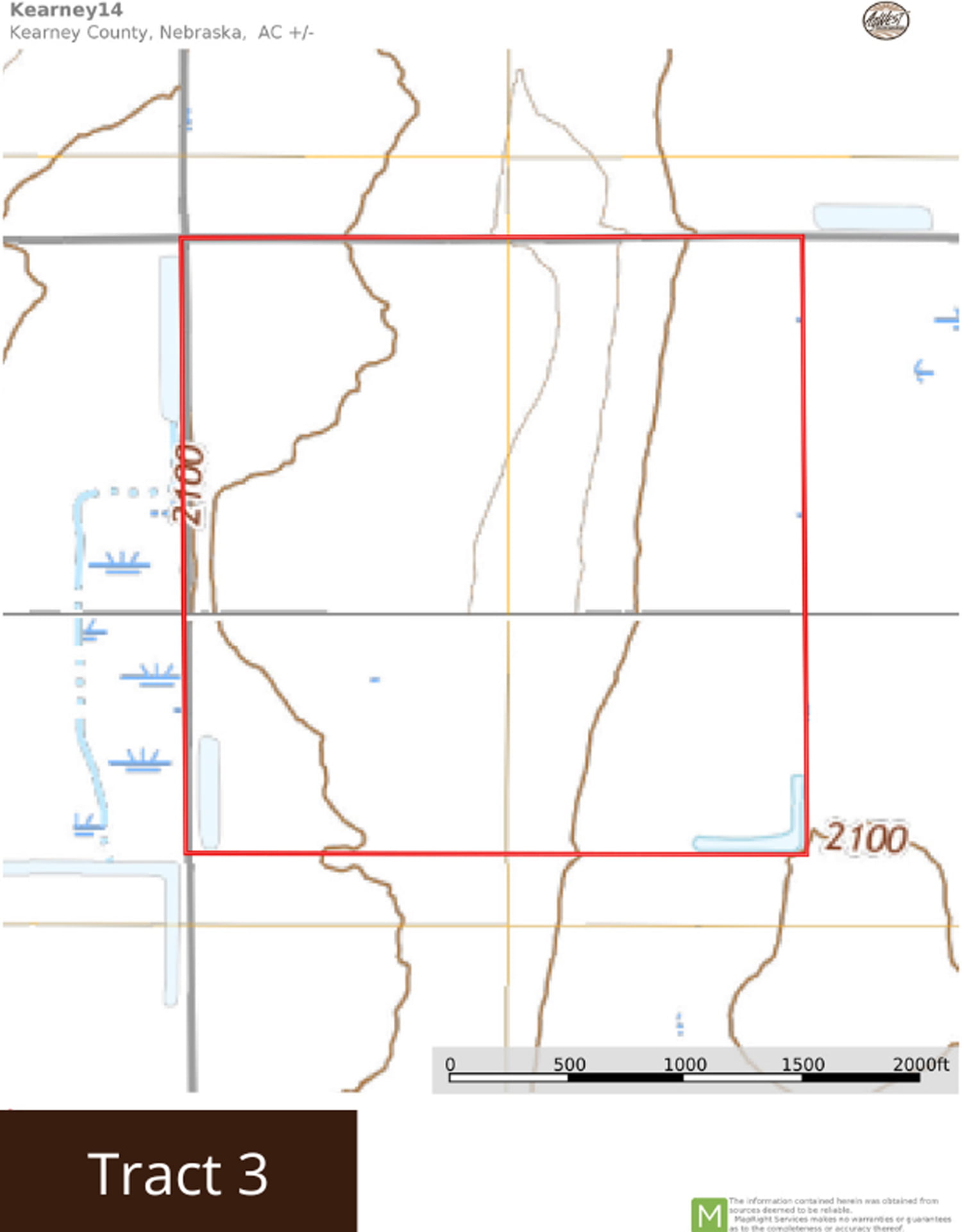 Property Directions – From the town of Norman in eastern Kearney County, travel 7 miles south on 40 Road to C Road. Turn east and go 1 mile to 41 Road. Tract 3 is located on the southeast corner of C Road and 41 Road.