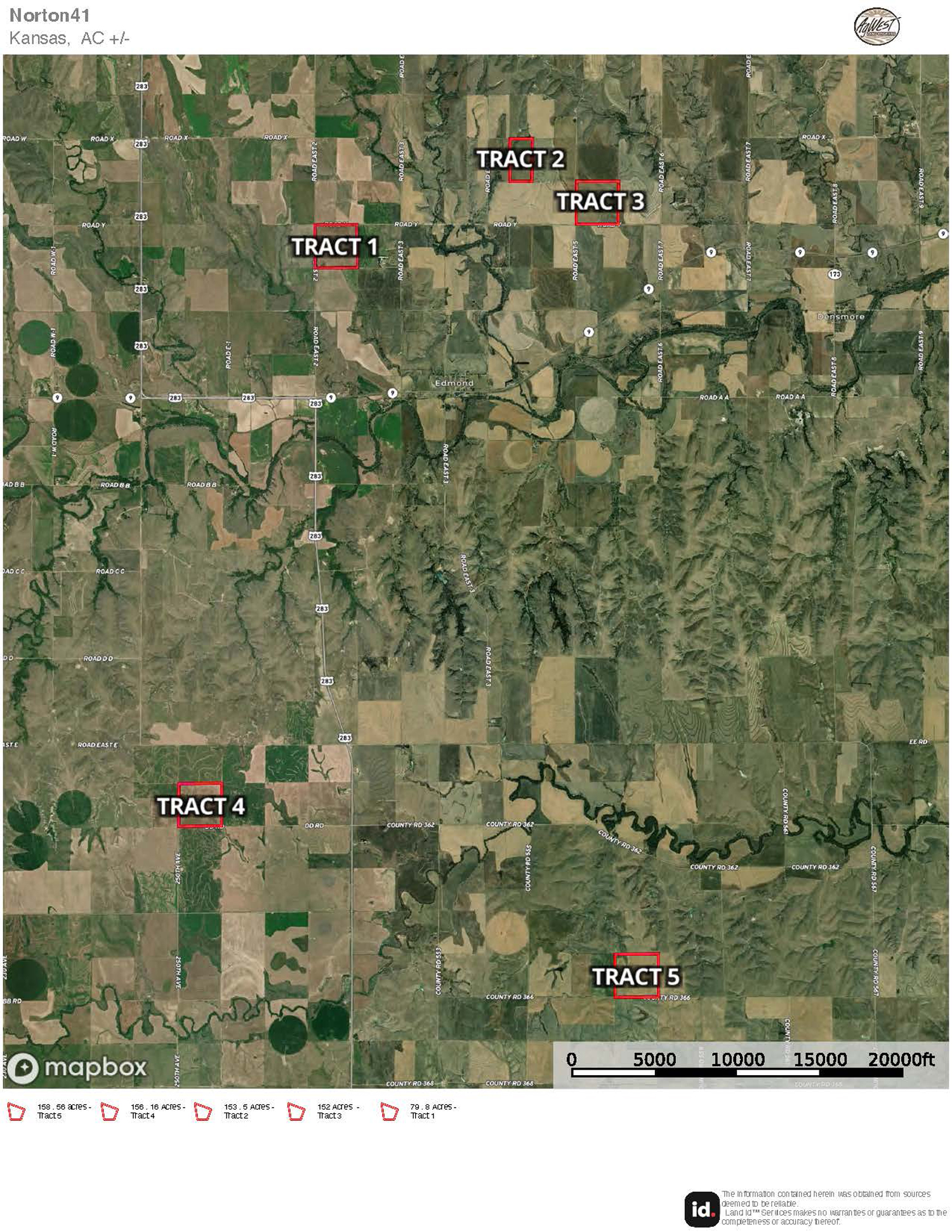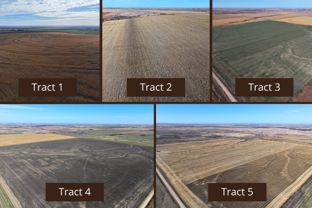 Tract 5: From Edmond, travel west on Highway 9 for 1.5 miles, turning south onto Highway 283. Continue on Highway 283 for 8 miles, then turn east onto County Road AA. Continue east on County Road AA for 3 miles and follow the curve north (County Road 300th Ave) for 1 mile. The property will be located northeast of intersection BB and 300th Ave.