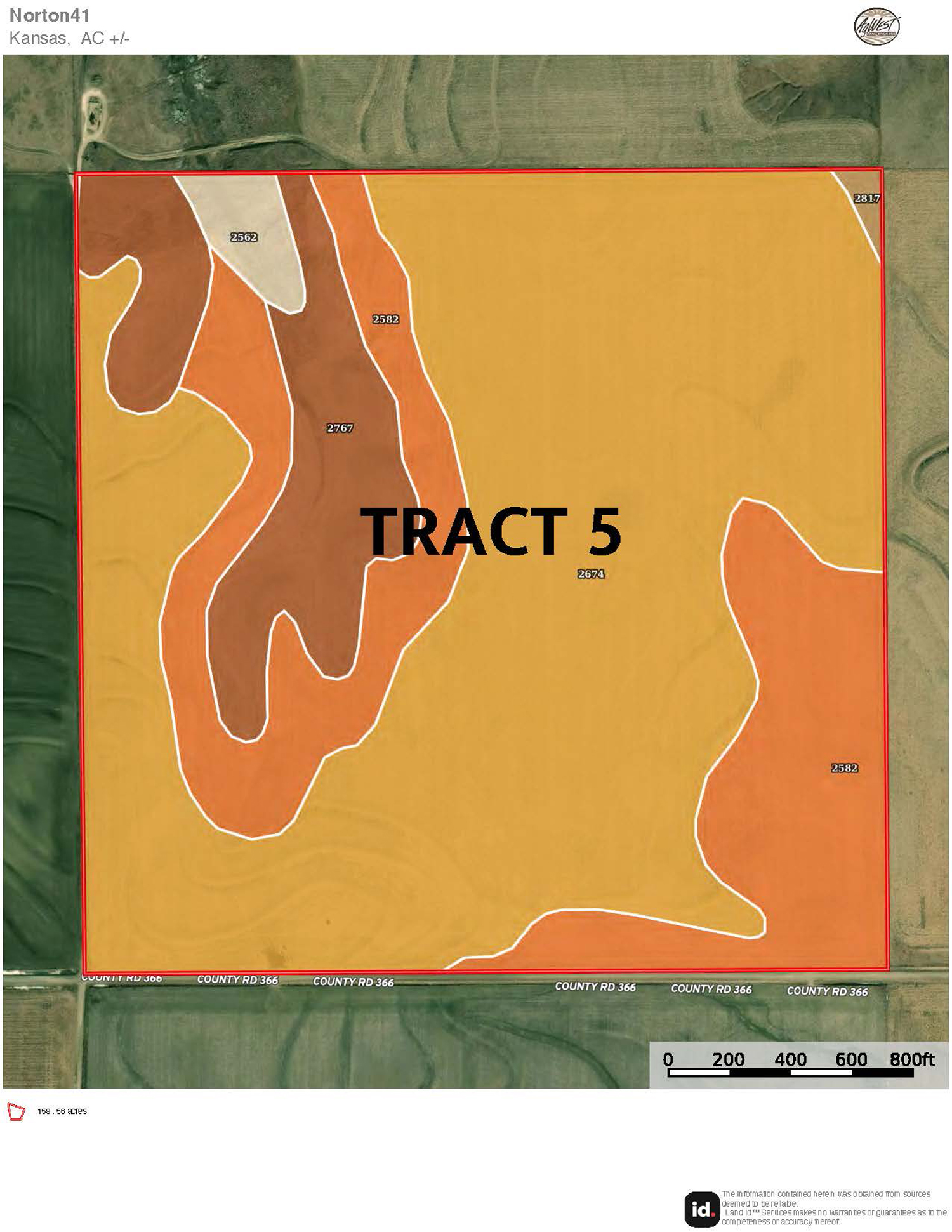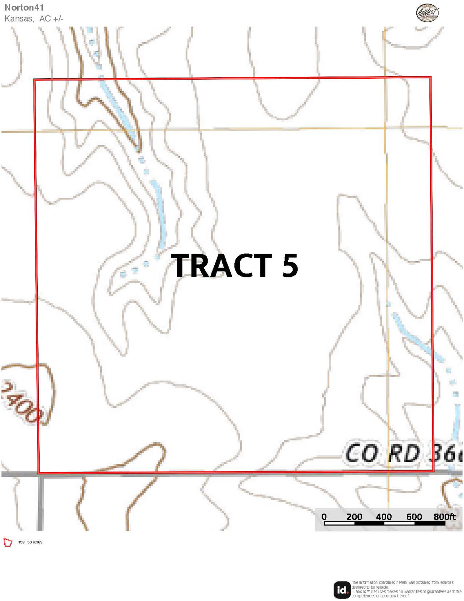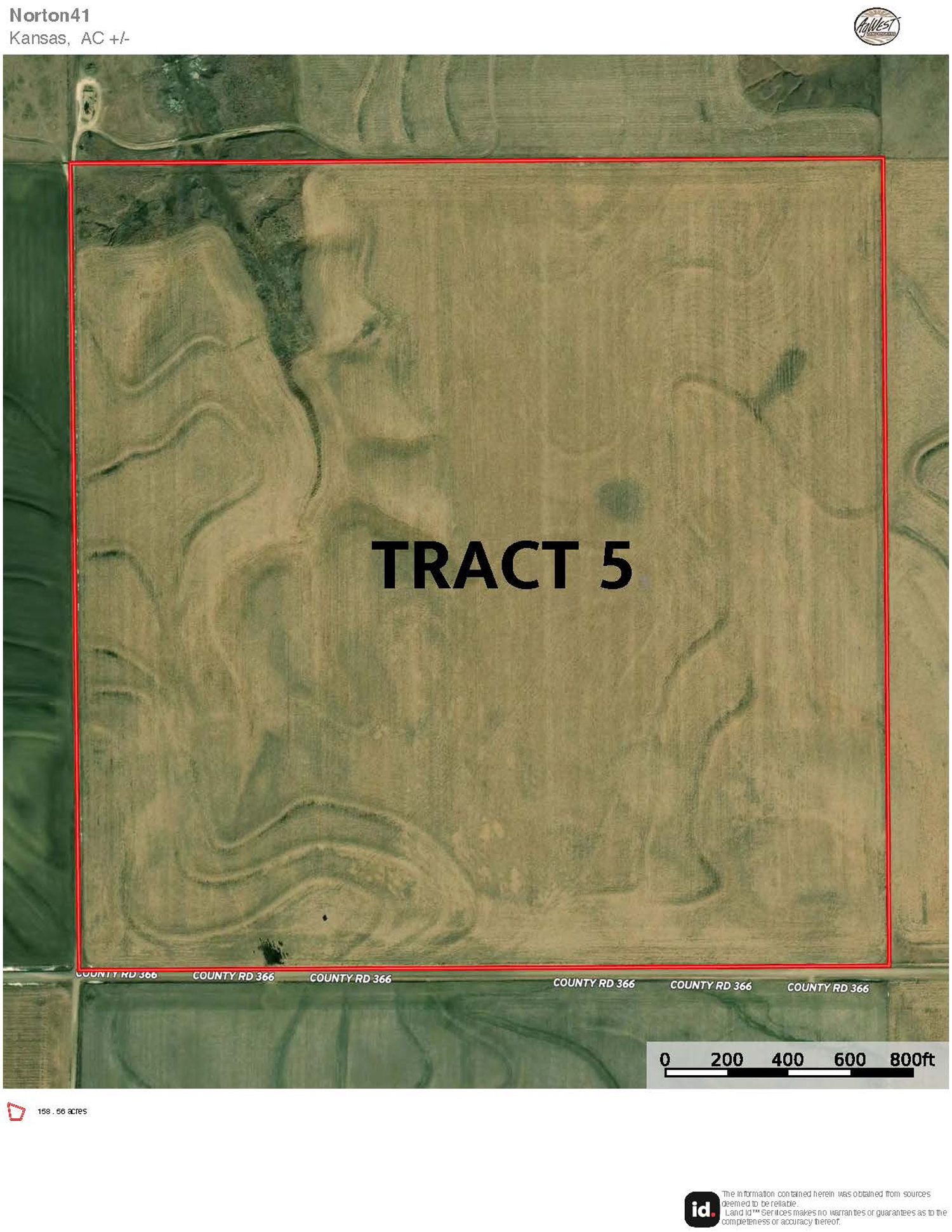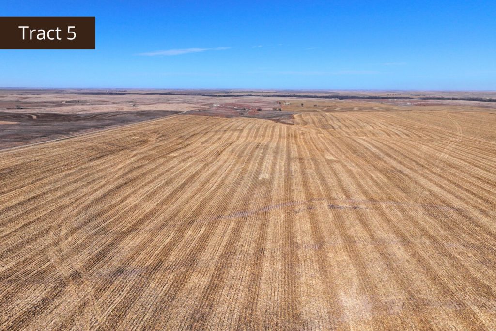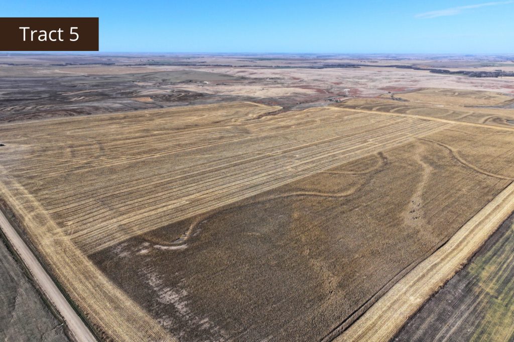 Description: Tract 5 is located along County Road BB, in Graham County, Kansas. This farm is almost fully tillable, with 150.91+/- acres of farmland and the remaining 7.62+/- acres consisting of a long draw stretching south into the property. Filled with fireweeds, thickets, and native grasses, this draw provides great wildlife habitat for upland game birds, whitetail deer, and mule deer, giving you an added hunting potential for the property. Most of the tillable acres are fertile Holdrege silt loam soil, with minimal slope covering much of the upland farm with the exception of a few pockets being slight to moderate slope. There are 137.87 established base acres for wheat and corn and it is currently corn stalks. Buyer will have immediate possession upon successful closing of the property. Signs will be posted.