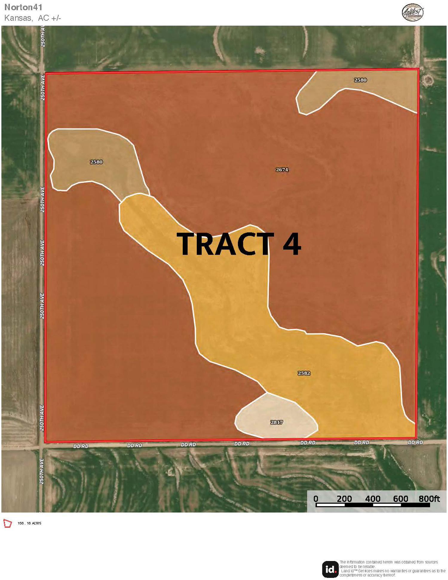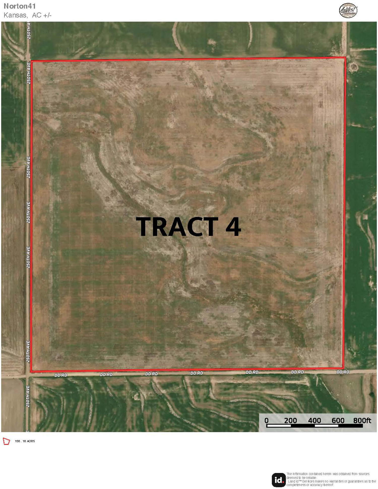 Description: Tract 4 is located 2 miles west of US Highway 283 at the intersection of County Roads 250th Avenue & DD. Comprised of 155.63+/- tillable acres (see FSA data), here is an excellent, upland Graham County farm near the Norton County line. Fully tillable, the gentle landscape of this property allows you to farm the entire tract with ease. With fertile Holdrege silt loam soil across most of the acres, and ease of access to Highway 283, you cannot find a better Graham County farm on the market today. This tract has base acres for corn and wheat totaling 142.26 acres and is currently wheat stubble. Buyer will have immediate possession upon the successful closing of the property. Signs will be posted.