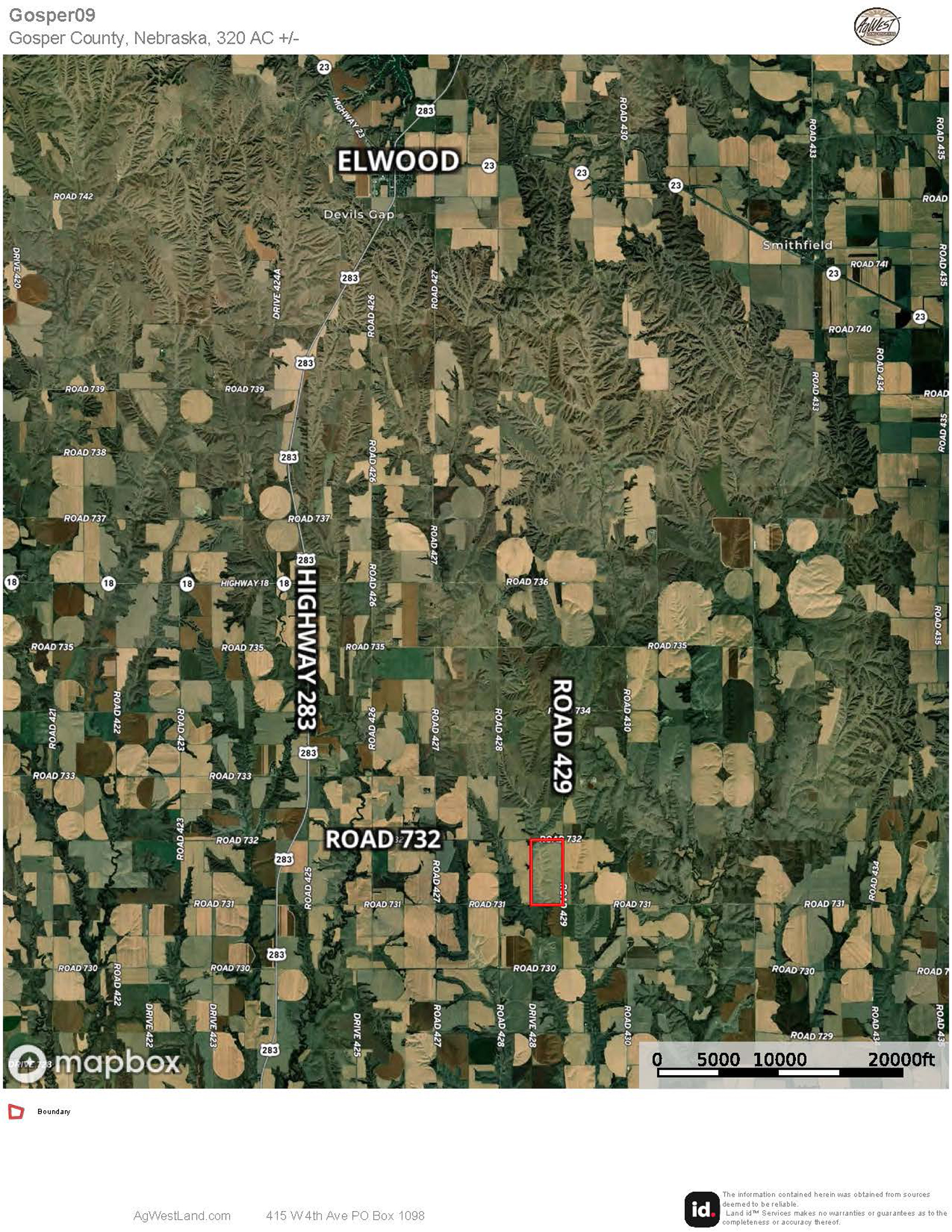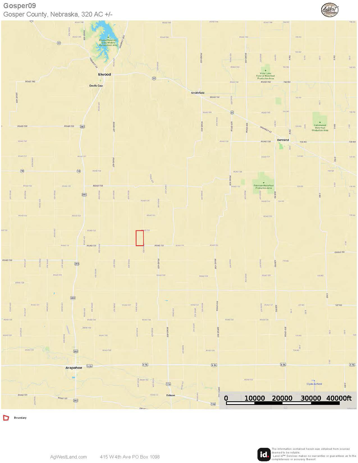 The information contained herein is as obtained by AgWest Land Brokers LLC—Holdrege, NE from the owner and other sources. Even though this information is considered reliable, neither broker nor owner make any guarantee, warranty or representation as to the correctness of any data or descriptions. The accuracy of such statements should be determined through independent investigation made by the prospective purchaser. This offer for sale is subject to prior sale, errors and omissions, change of price, terms or other conditions or withdrawal from sale in whole or in part, by seller without notice and at the sole discretion of seller. Readers are urged to form their own independent conclusions and evaluations in consultation with legal counsel, accountants, and/or investment advisors concerning any and all material contained herein. Maps are for illustrative purposes only and are not intended to represent actual property lines.